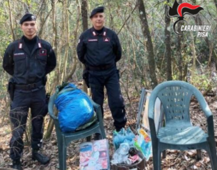 MONTECATINI VALDICECINA — Nel bosco lungo la strada provinciale 32, nel territorio comunale di Montecatini Val di Cecina, i Carabinieri della stazione di Ponteginori e i militari del Nucleo forestale di Volterra hanno smantellato un bivacco verosimilmente utilizzato dagli spacciatori.