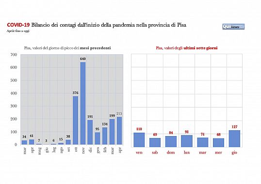 PISA — Nessun nuovo decesso ma le nuove positività al coronavirus rilevate in provincia di Pisa nell'arco delle ultime 24 ore tornano a tre cifre attestandosi a 127, questi i dati riferiti oggi dalla Regione Toscana.