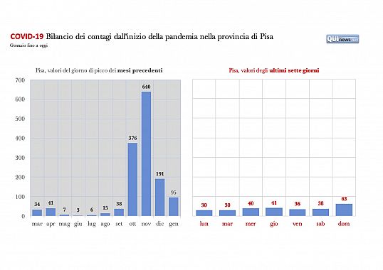 Questa la ripartizione dei nuovi casi per ambito e Comune di residenza, come riferita dalla Ausl nord ovest e dalla Ausl centro: Area pisana 42 nuovi casi (Calci 2, Cascina 19, Pisa 15, San Giuliano Terme 2, Vecchiano 1, Vicopisano 3), Valdera e Alta Valdicecina 9 casi (Capannoli 4, Casciana Terme Lari 2, Pontedera 3), Comprensorio del Cuoio 12 casi (Castelfranco di Sotto 6, San Miniato 5, Santa Croce sull'Arno 1)