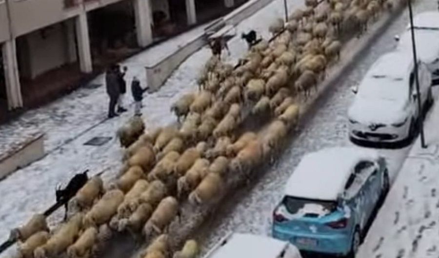 Ecco una scena che strappa un sorriso. Nel bel mezzo della nevicata, un gregge ha invaso le strade passeggiando per le vie, tra auto e scampanelli