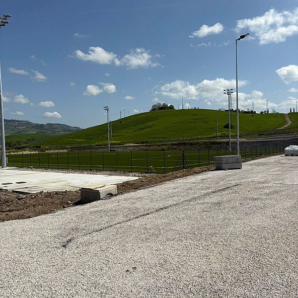 Il cantiere ha già visto l'installazione delle torri faro, che garantiranno l’illuminazione notturna del rettangolo di gioco, quella del manto erboso e la chiusura dei lavori relativi alla recinzione e alla realizzazione degli accessi necessari alla fruizione dell’area sportiva. La seconda tranche dei lavori riguarderà invece la costruzione degli spogliatoi, delle tribune dedicate al pubblico e dei locali tecnici necessari ad ospitare i servizi di bar e biglietteria, completando un impianto dal valore stategico per il mondo dello sport e per quello della socialità.